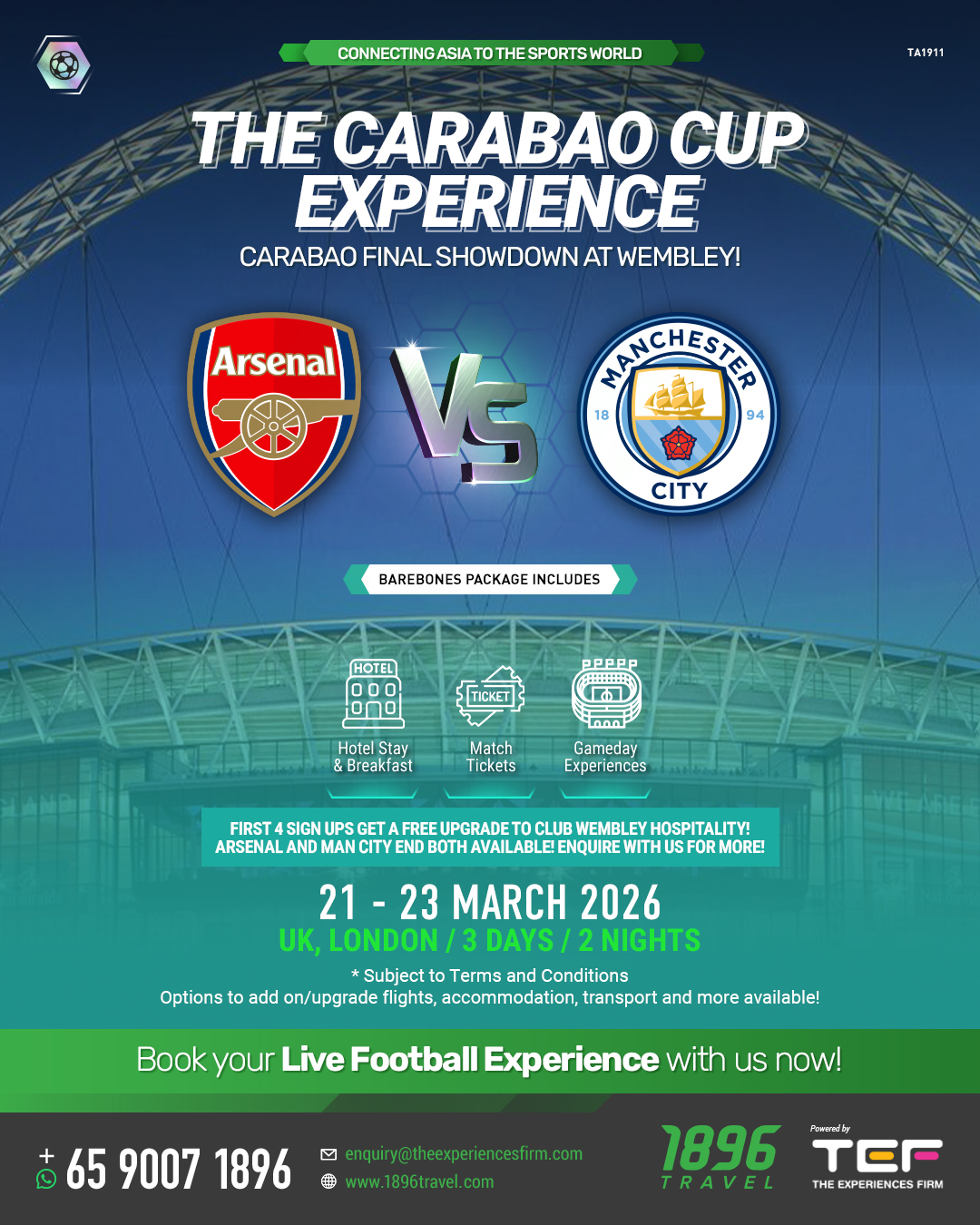 - Carabao Cup Final Experience Ticket for Arsenal vs Manchester City (First 4 sign ups get a free upgrade to Club Wembly Hospitality!)